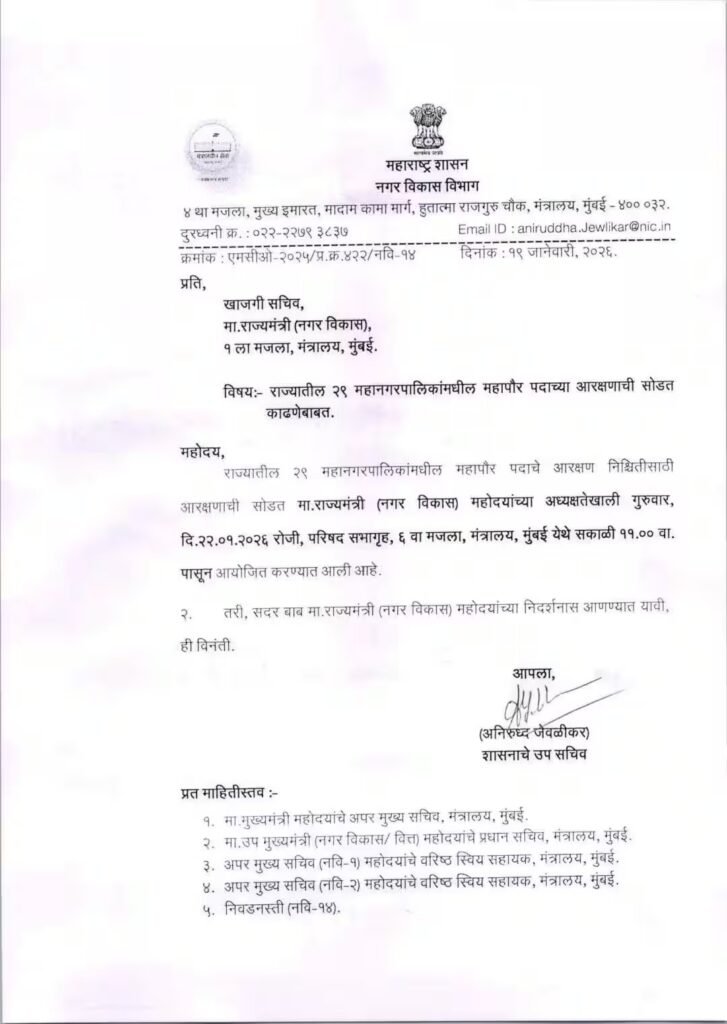 महाराष्ट्रातील 29 महानगरपालिकांसाठी महापौरपदाच्या आरक्षणाची सोडत 22 जानेवारी 2026 रोजी मंत्रालयात होणार आहे. नगरविकास विभागाने याबाबत अधिकृत पत्र जारी केले आहे.